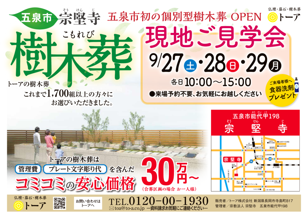 五泉市能代(のうだい)の宗堅寺で、個別型樹木葬 「樹木葬こもれび五泉」 の 現地見学会 を開催いたします。