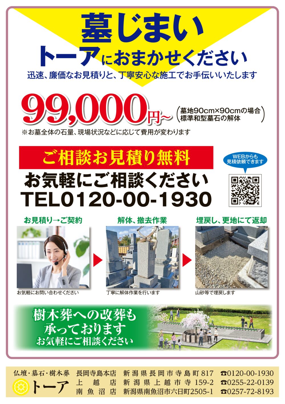 費用面が気になる方にもご検討いただきやすいよう、**墓じまい 99,000円(税込)~**のご案内もございます。